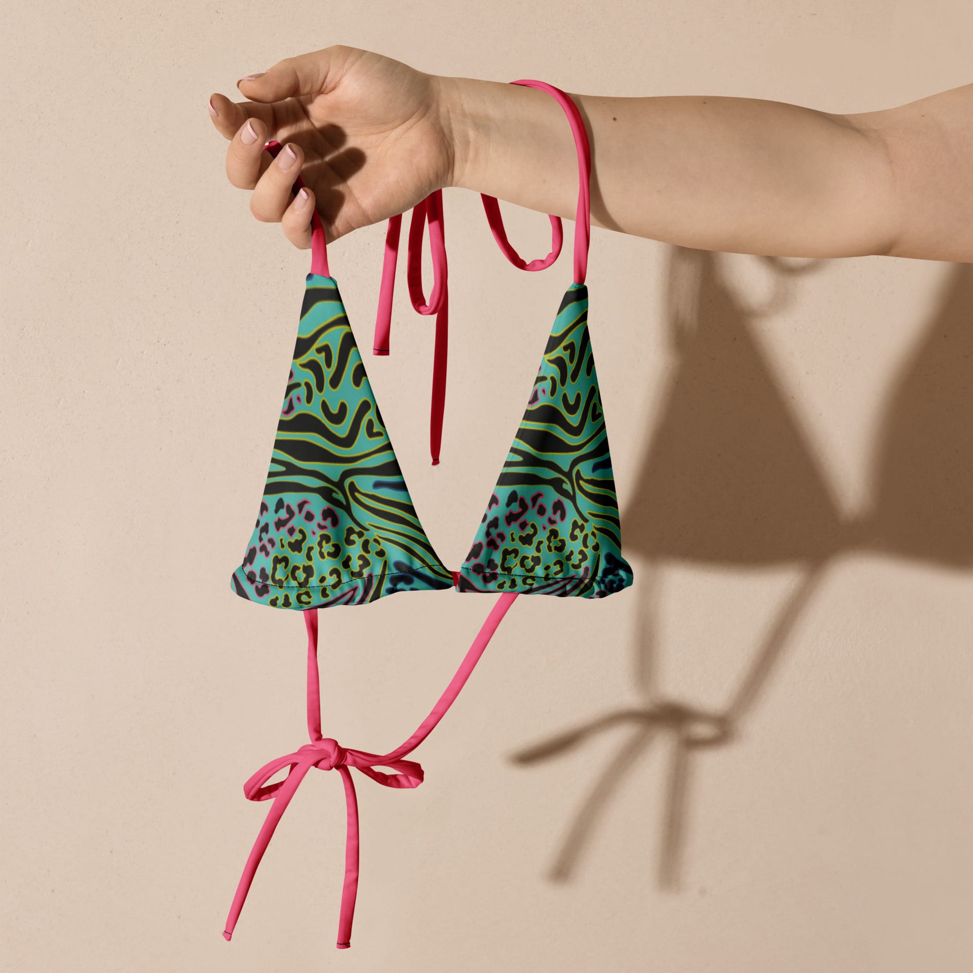 Get ready for the summer season with this eco-friendly, recycled-fabric all-over print padded bikini top. The top is made from soft recycled fabric, with UPF 50+ protection and versatile, stretchy straps that are perfect for wearing in style. Get yours today and pair it with a beach outfit.