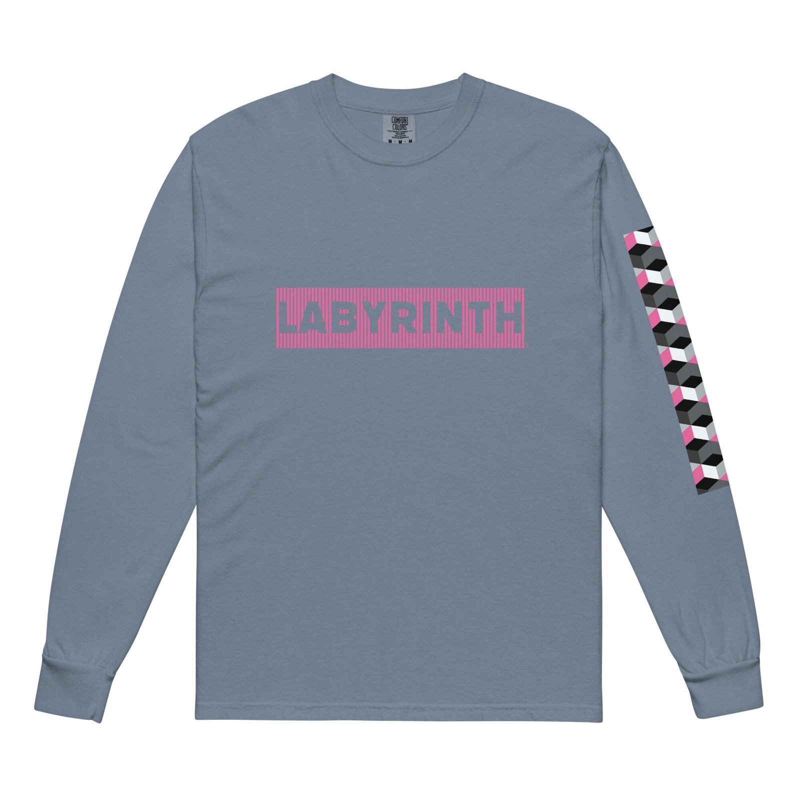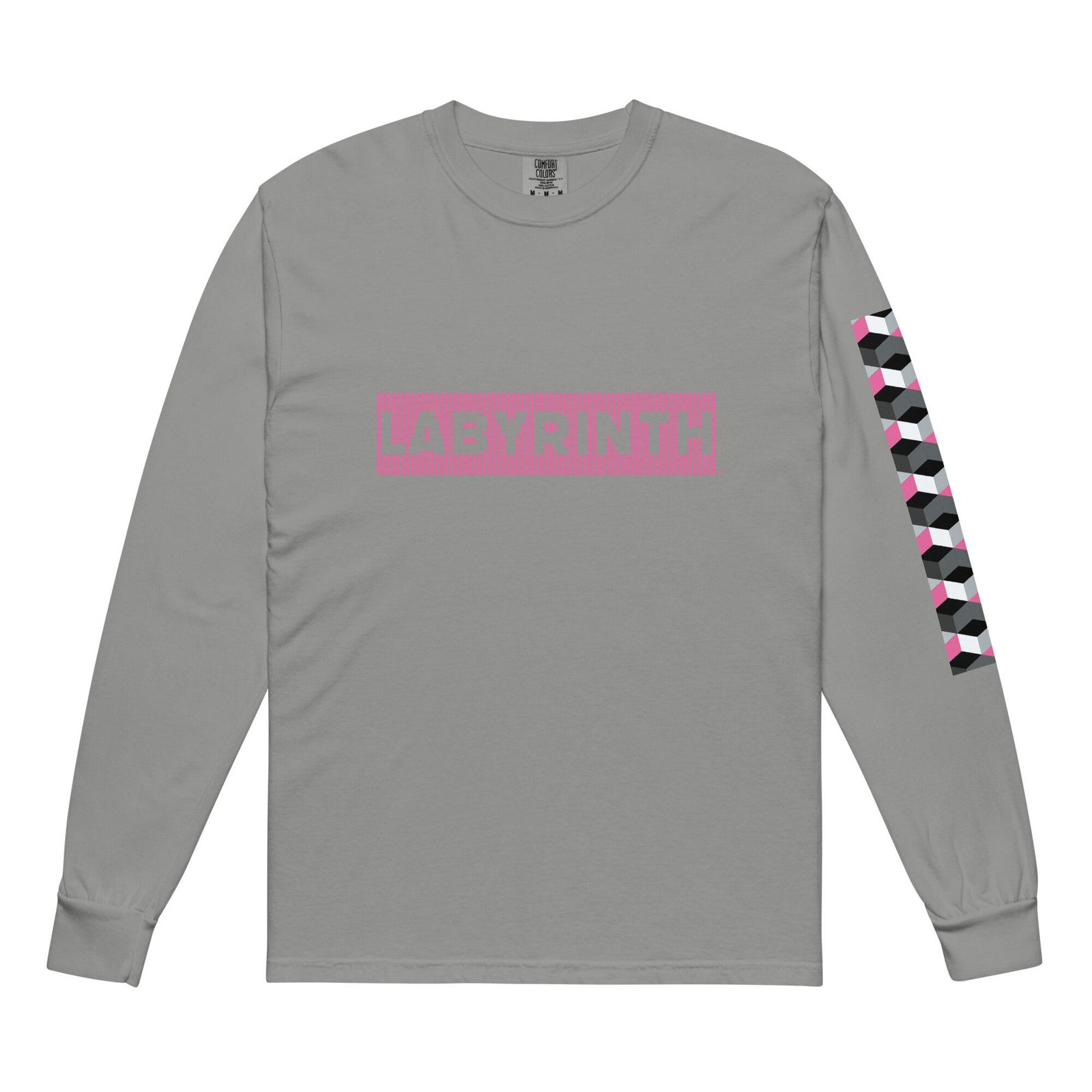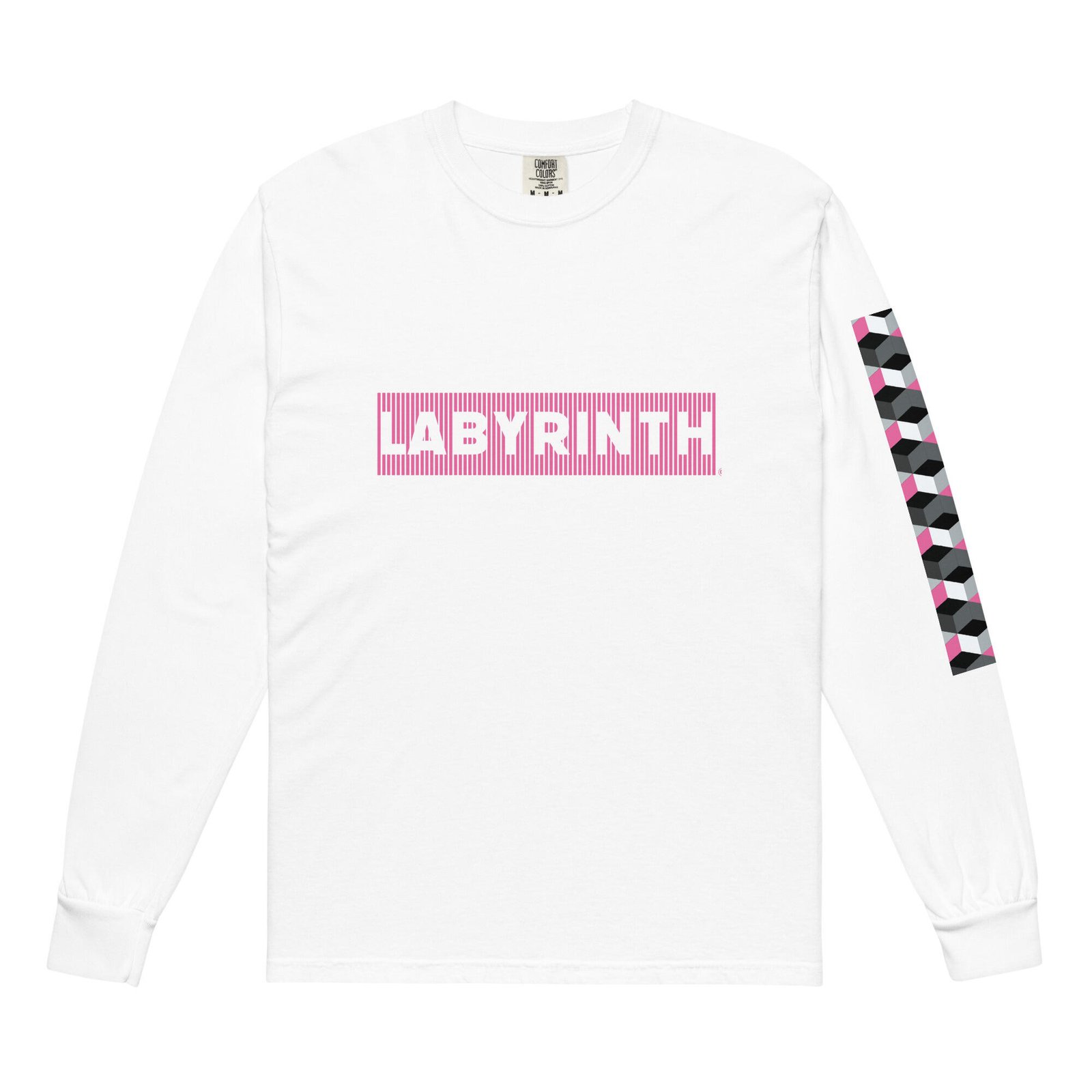 Designed for those who find their way through the city with precision and style, this piece transforms a classic silhouette into a statement of industrial art. The Labyrinth model features the collection’s name prominently on the chest, framed by vertical stripes that evoke a sense of digital structure. The left sleeve is adorned with a cascading geometric cube pattern in shades of pink, gray, and white, adding a three-dimensional depth to your streetwear aesthetic.