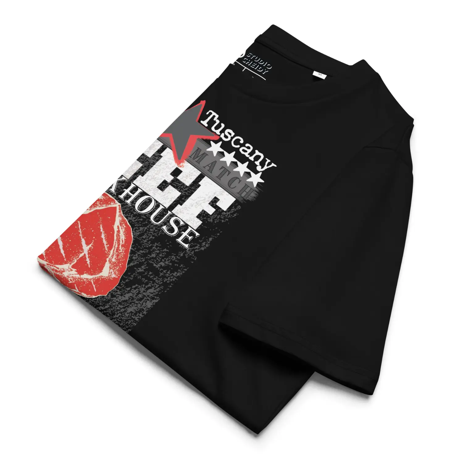 Men’s streetwear T-shirt in black. 100% organic or vegan beef is the next-generation slogan printed on the front. “Conscious Thinking”. Inspired by Tuscany and Florence, a region where meat culture is deeply rooted and symbolized worldwide by the Fiorentina steak, this piece creates a dialogue between tradition and change, identity and new food choices shaped by climate, environment, and personal well-being.