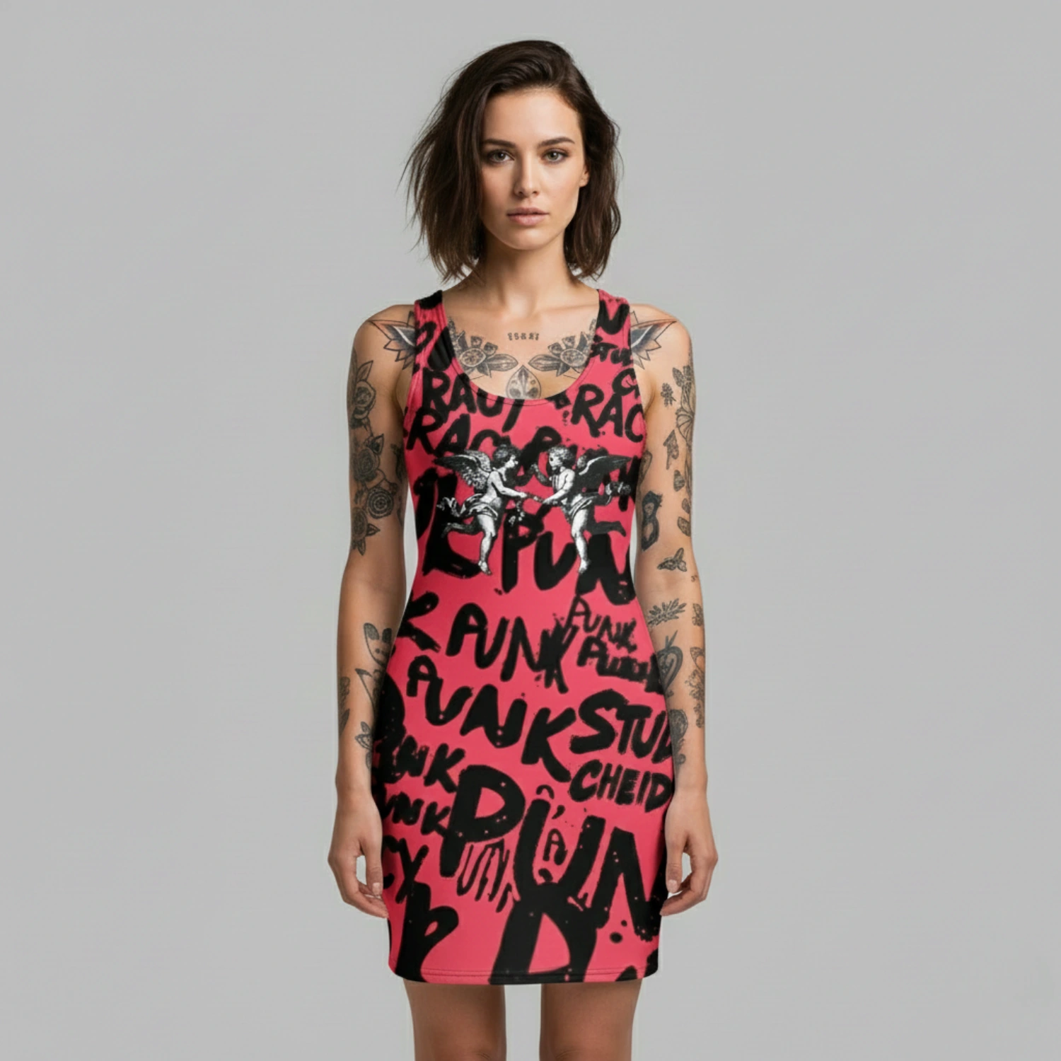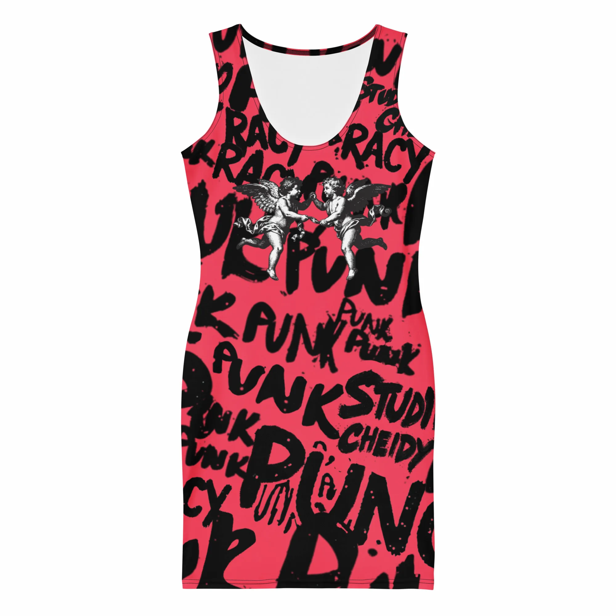 The striking black graffiti print and Angels graphic add a raw aesthetic, elevating the design to a higher level of fashion statement. The fitted silhouette, reaching mid-thigh length, is perfect for flattering the figure and is ideal for evening events, parties, or as the key piece in a structured and sophisticated streetwear look. The recycled polyester and elastane blend ensures a perfect fit, maximum comfort, and vibrant color reproduction, ensuring the garment maintains its shape and visual impact. The overlock seams and blanket hem ensure durability and long-lasting wearability.