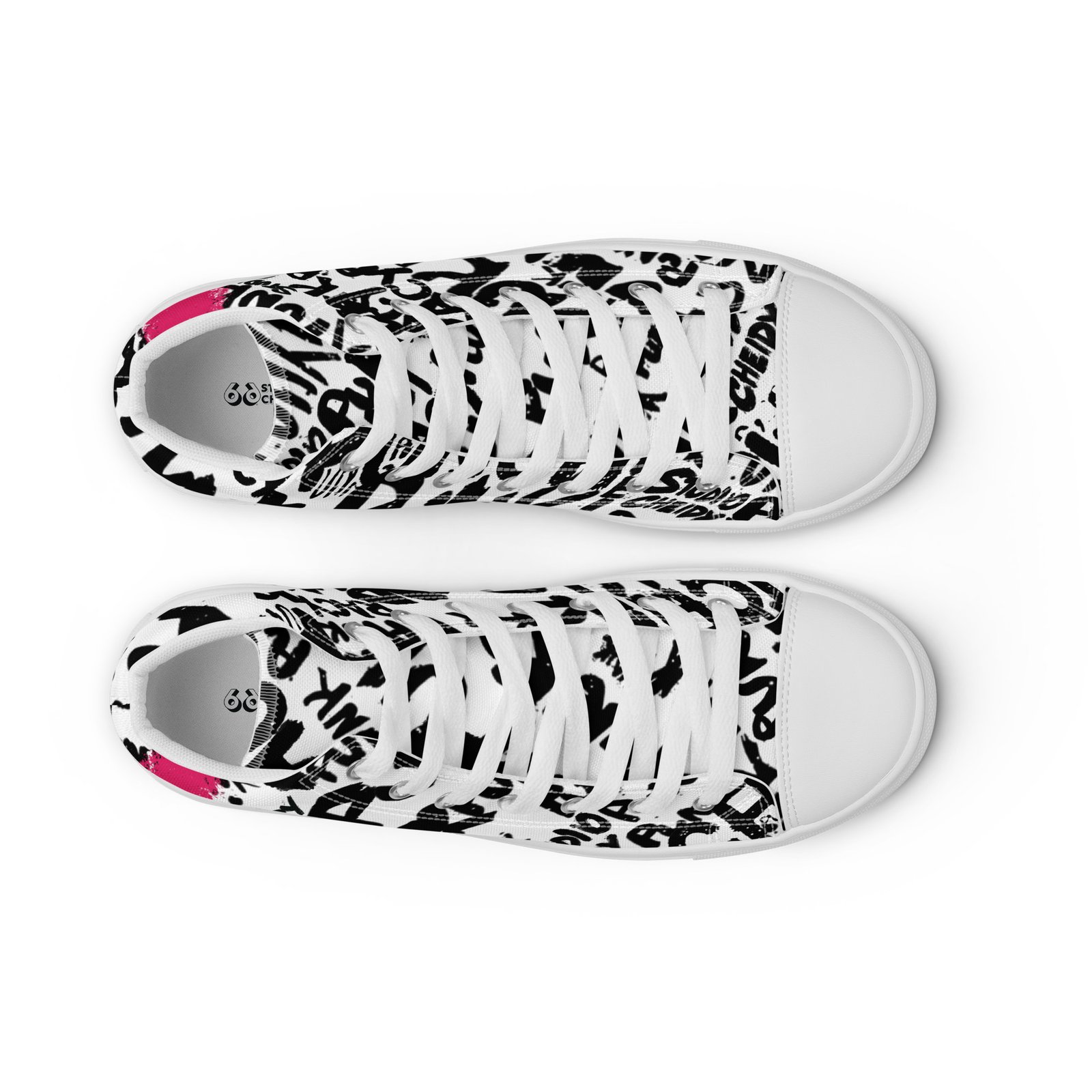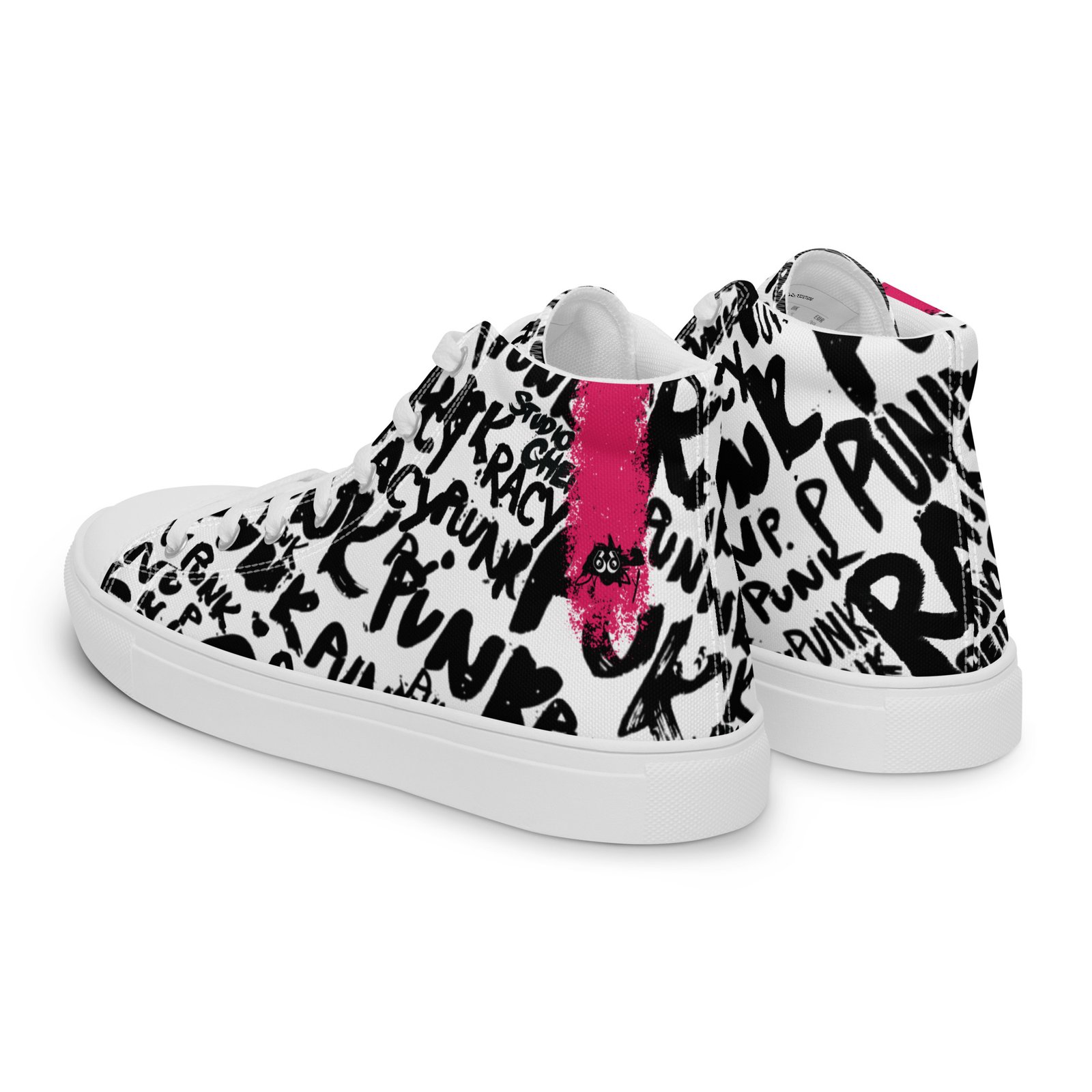 Elevate your footwear game with the Punk Script High Tops. Designed for writers, rebels, and creators, these sneakers turn the classic high-top silhouette into a wearable canvas. The high-contrast black and white graffiti pattern is interrupted by a bold neon stroke on the heel, making them a centerpiece for any streetwear outfit.