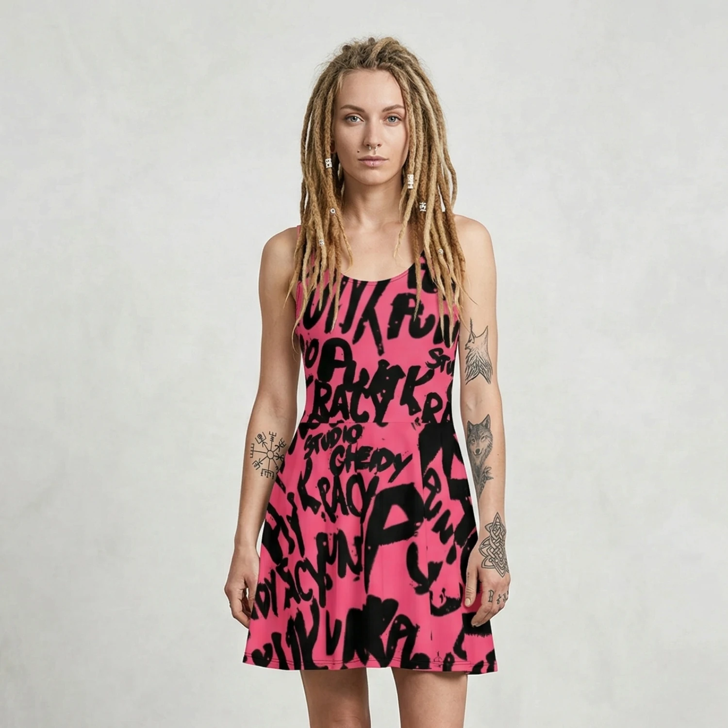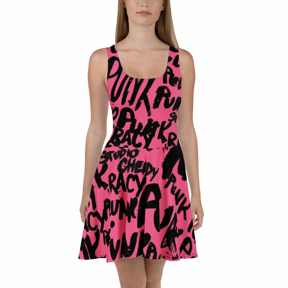 Crafted from a soft and stretchy high-quality fabric, this dress features a vibrant all-over graffiti-inspired print that perfectly blends the boldness of street style with a modern design. The Graffiti skater dress is a must-have piece, your essential tool for expressing personality, energy, and an unmistakable urban and rebellious charm.