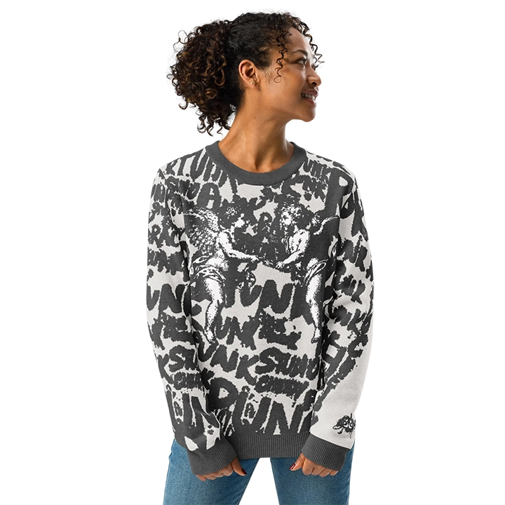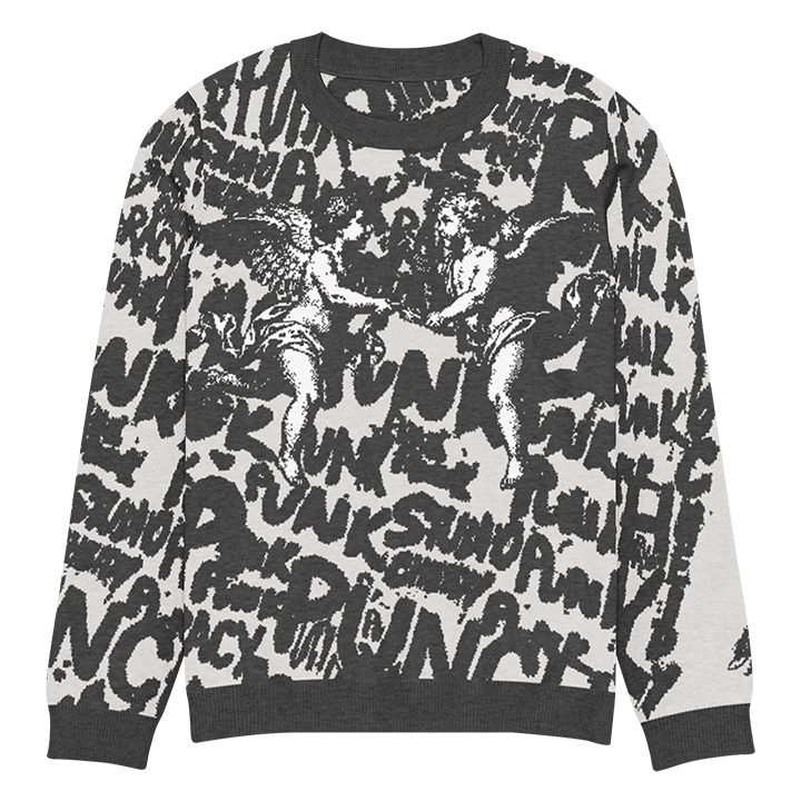Wear the Ice Angels women’s sweater, a combination of street-punk aesthetics and pure artistic expression. This jacquard sweater is a bold style statement: a combination of rebellious lettering and iconic angel graphics that define your look.