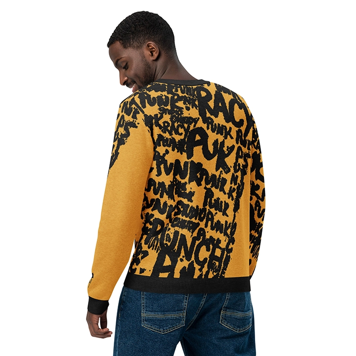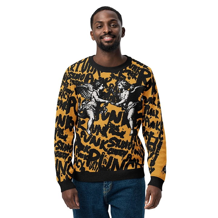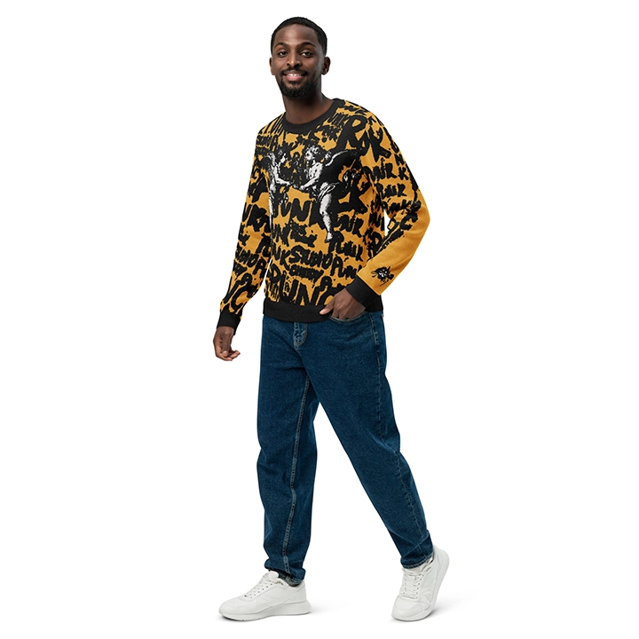 Wear the Yellow Angels men’s sweater, the perfect combination of street-punk aesthetics and pure artistic expression. The design of this jacquard sweater is a bold style statement: a combination of rebellious lettering and iconic angel graphics that redefine your entire look.