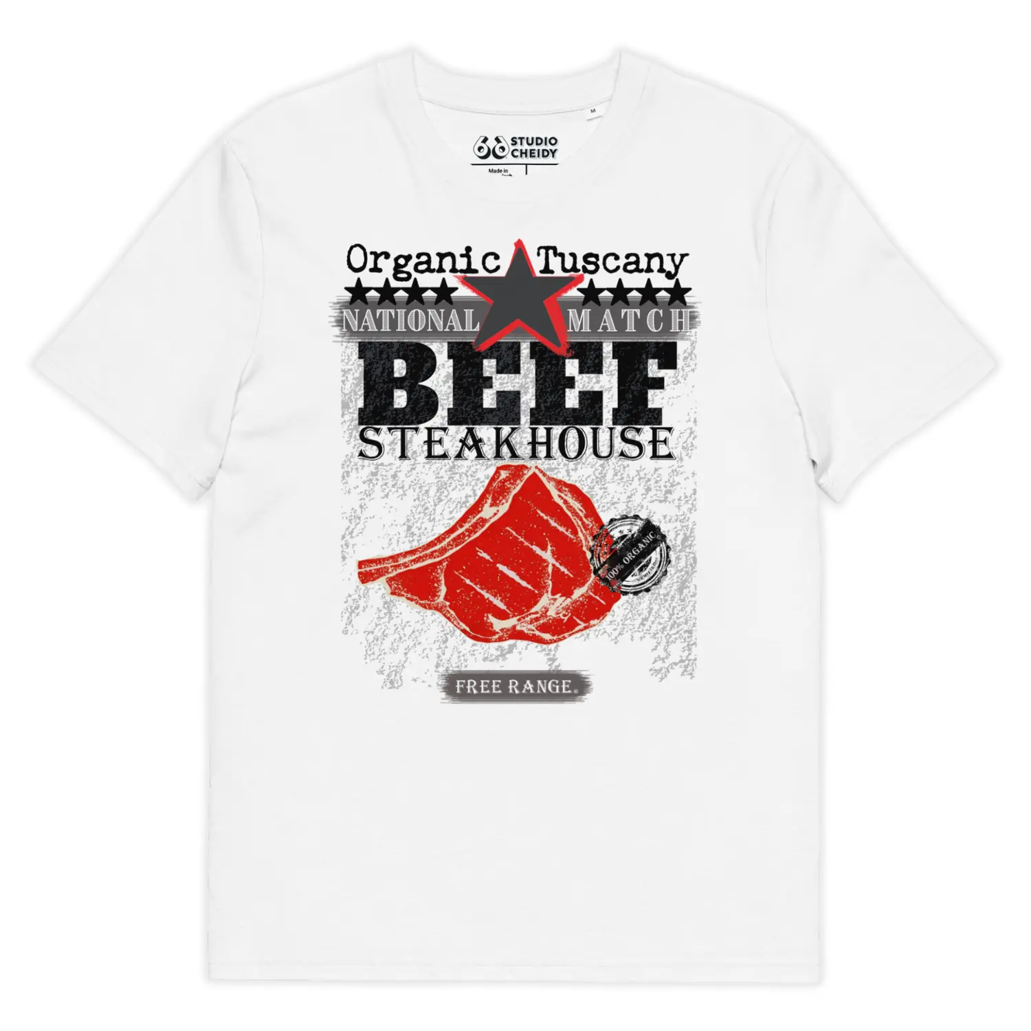 Men’s streetwear T-shirt with white background 100% Organic Beef is the next generation printed “conscious thinking” slogan. Inspired by Tuscany and Florence, a region where meat culture is deeply rooted and symbolized worldwide by the Fiorentina steak, this piece creates a dialogue between tradition and change, identity and new food choices shaped by climate, environment, and personal well-being.