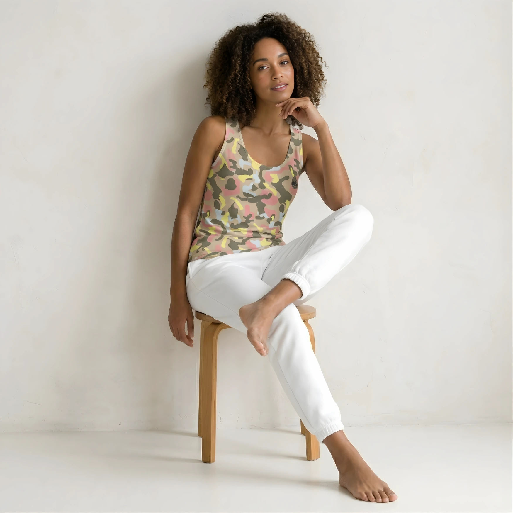 Make a bold statement with the Camouflage Pink Sporty Glam Tank Top. This design reimagines traditional military patterns with a fresh, feminine twist, blending soft pinks, energetic yellows, and cool blues into a sophisticated abstract camouflage. It’s the perfect fusion of “sporty” and “glam,” designed for the woman who wants to stand out while staying active.