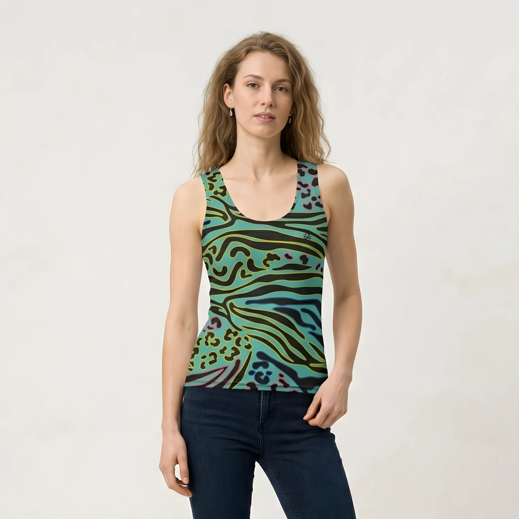 Dive into a world of vibrant patterns with the Camouflage Water Animal Tank Top. This unique design blends the fluid energy of water with a bold fusion of exotic animal prints. Featuring a stunning turquoise base layered with deep black zebra stripes and neon-accented leopard spots, this tank is for the woman who isn’t afraid to make a splash.