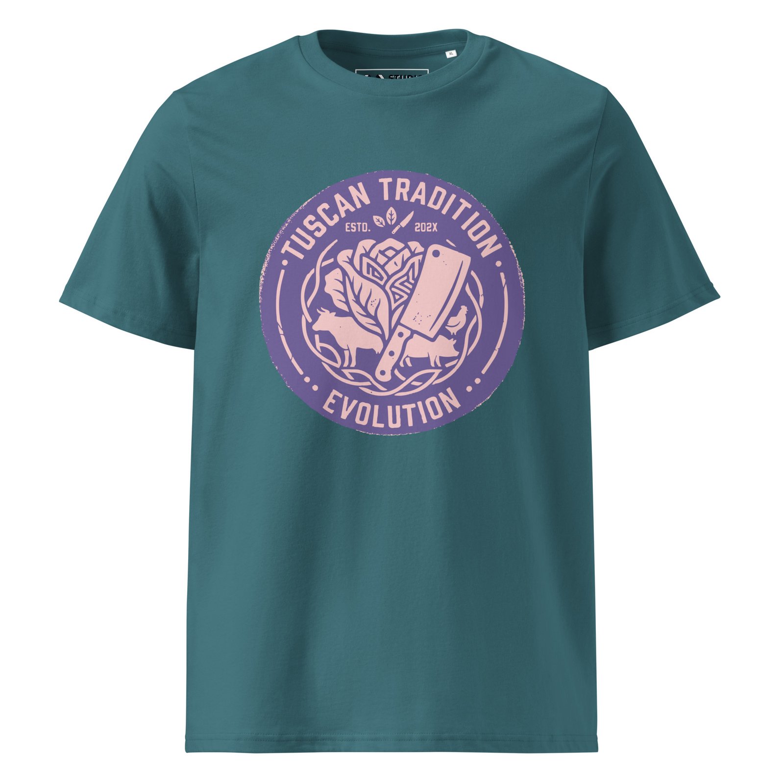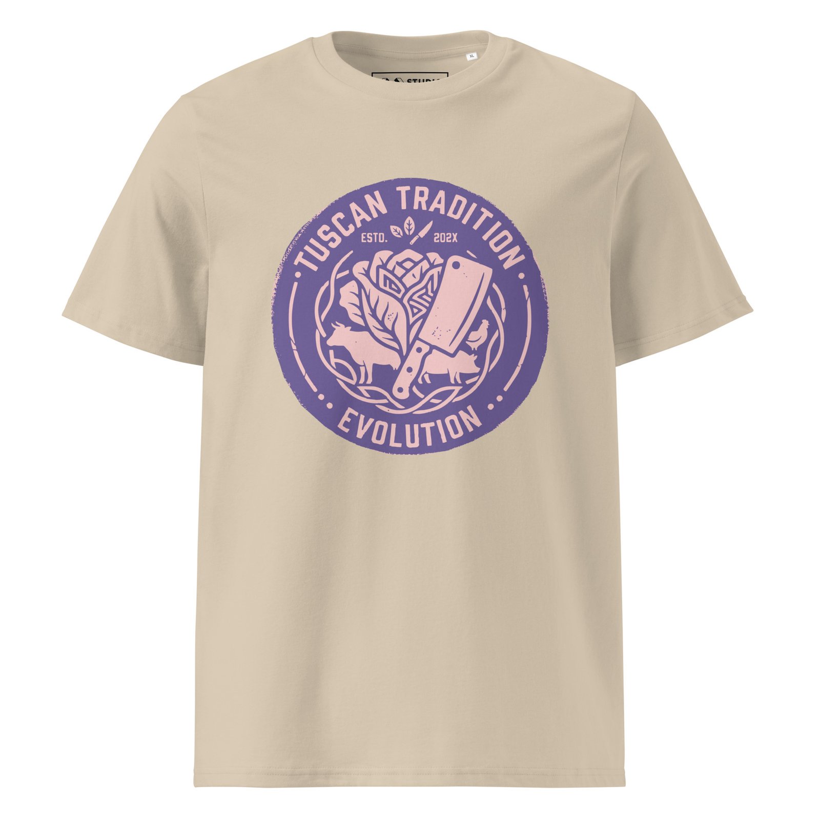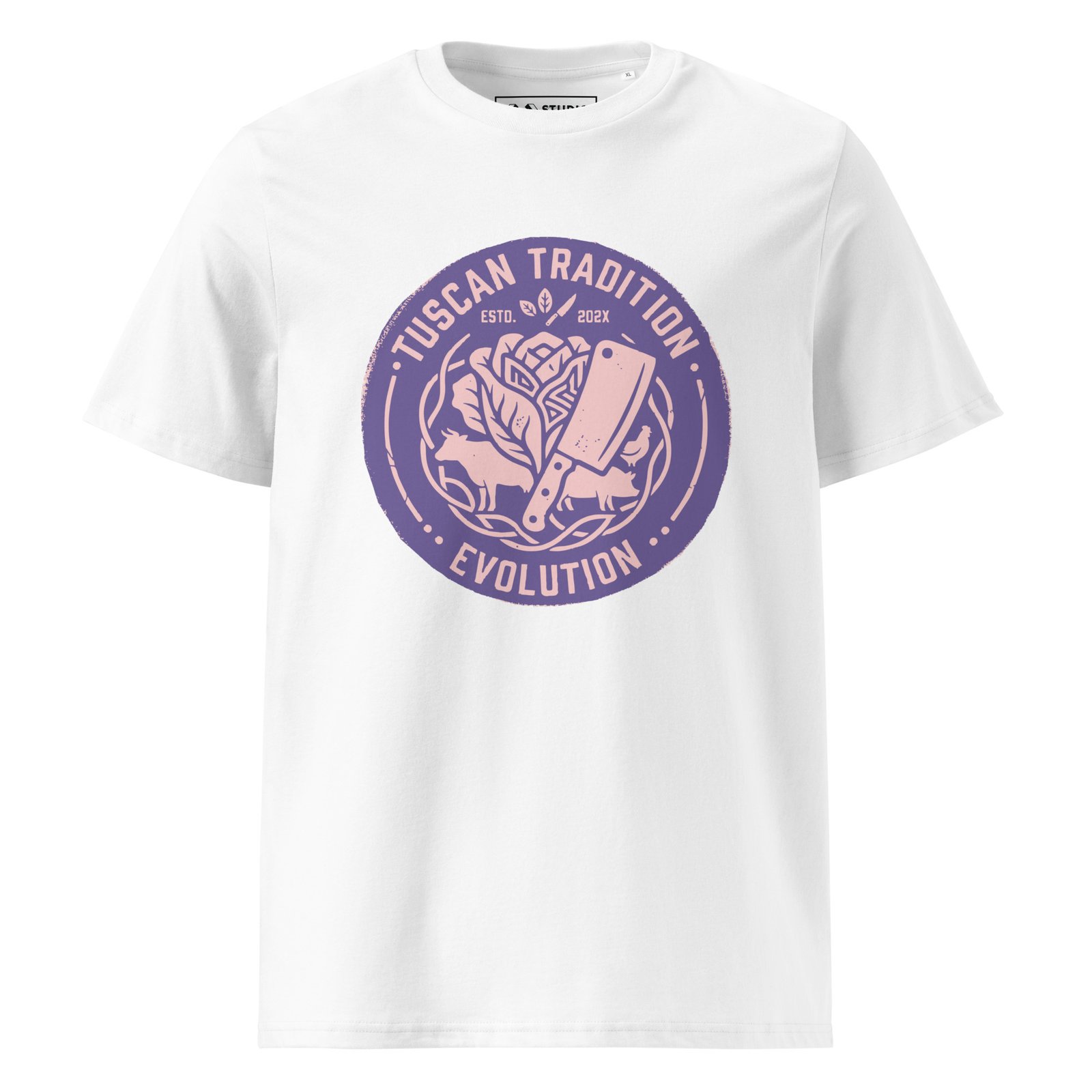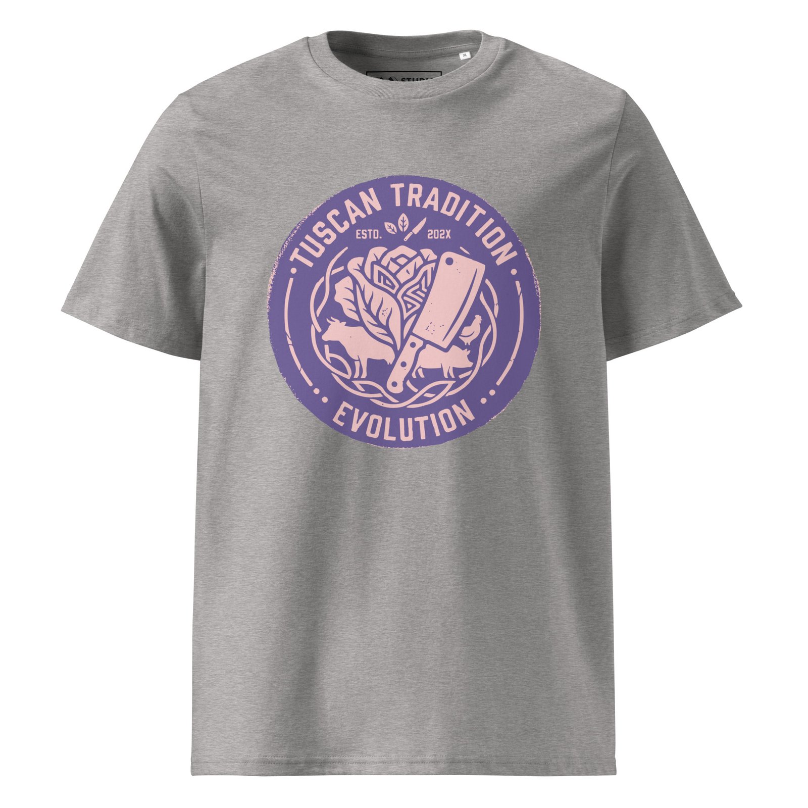 The Cyber Purple Edition takes our “Evolution” manifesto into a futuristic, synthwave-inspired dimension. The vertical industrial graphic featuring the cleaver repurposed for plant-based mastery and the artichoke heart crown is rendered in a vibrant, high-contrast purple that stands out with electric clarity. It’s a bold statement on how tradition can be transformed into something entirely new and vibrant.