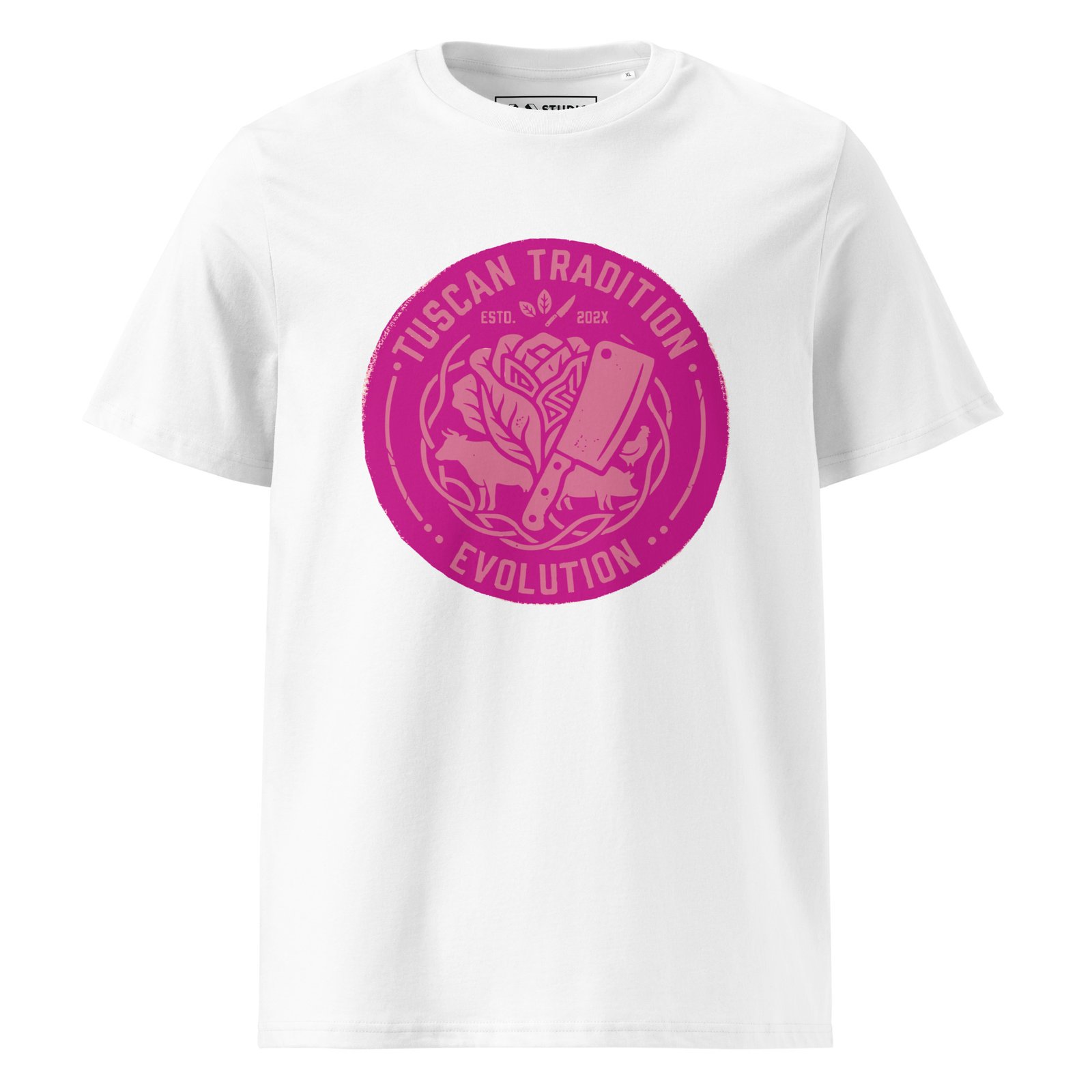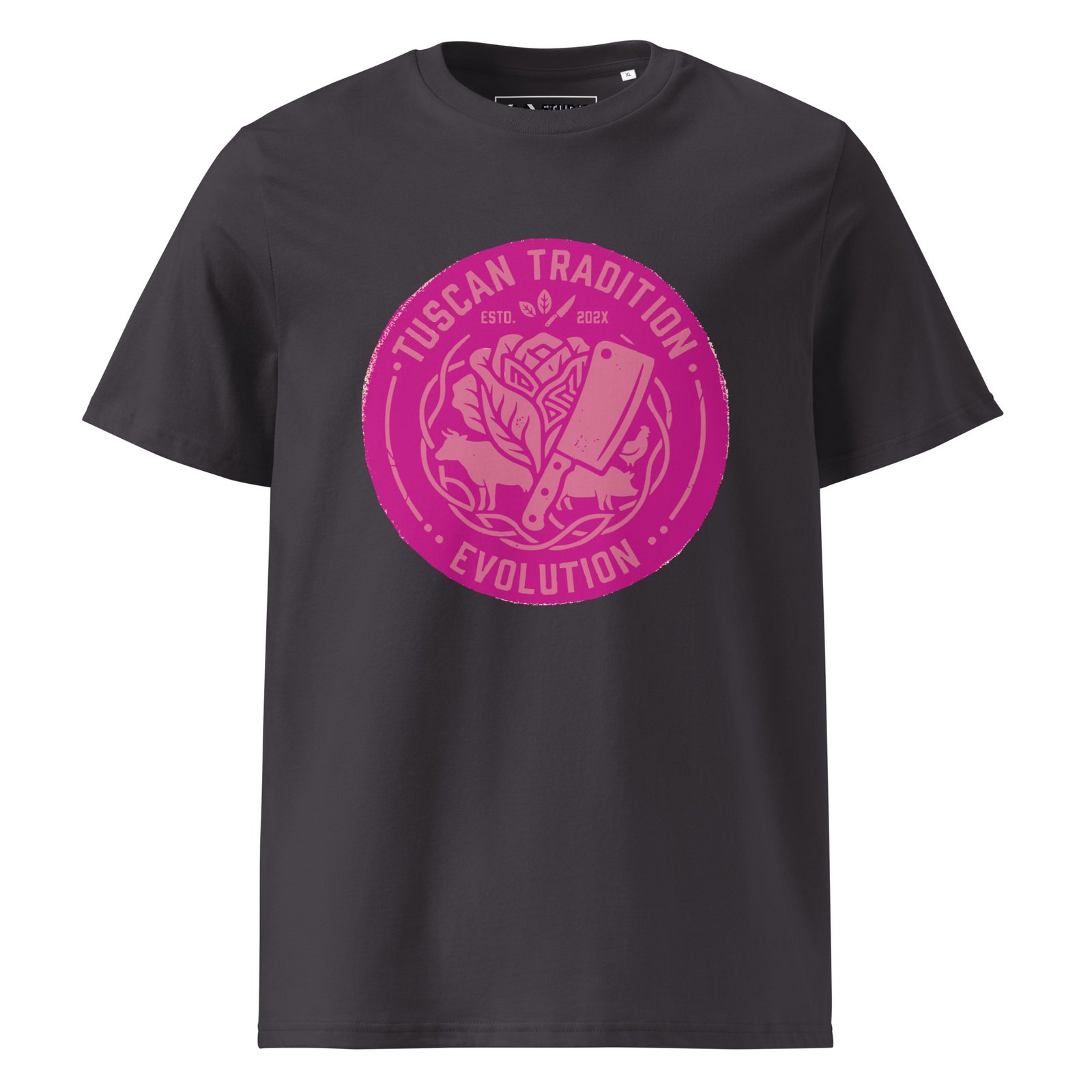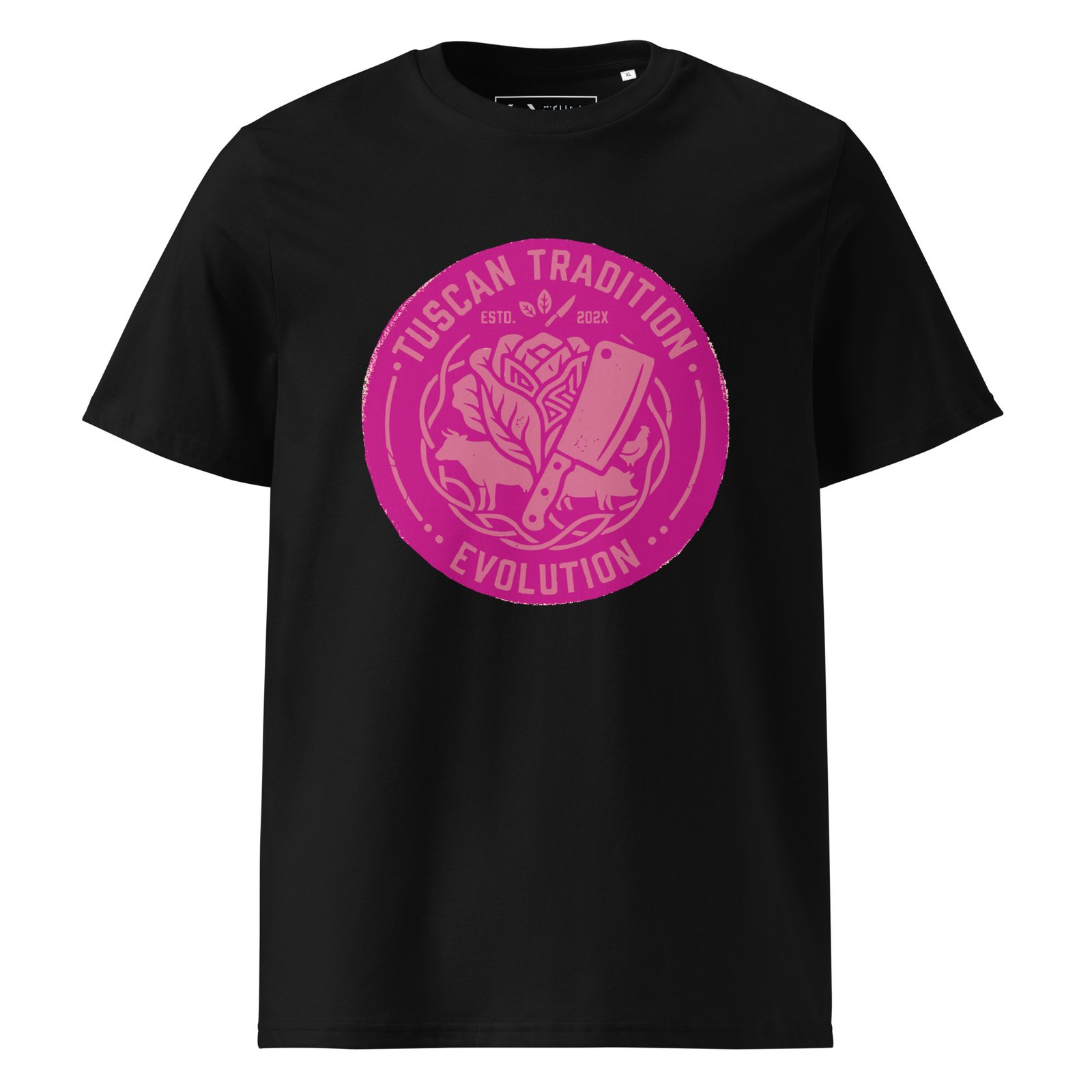 Bold, unapologetic, and visionary. The Vibrant Fuchsia Edition of our “Industrial Evolution” series takes the deconstructed butcher symbols and denches them in an electric magenta glow. The central “Evolution” claim and the repurposed cleaver now dedicated to the plant kingdom are highlighted by the sharp, spray-paint texture that defines the modern urban rebel.
